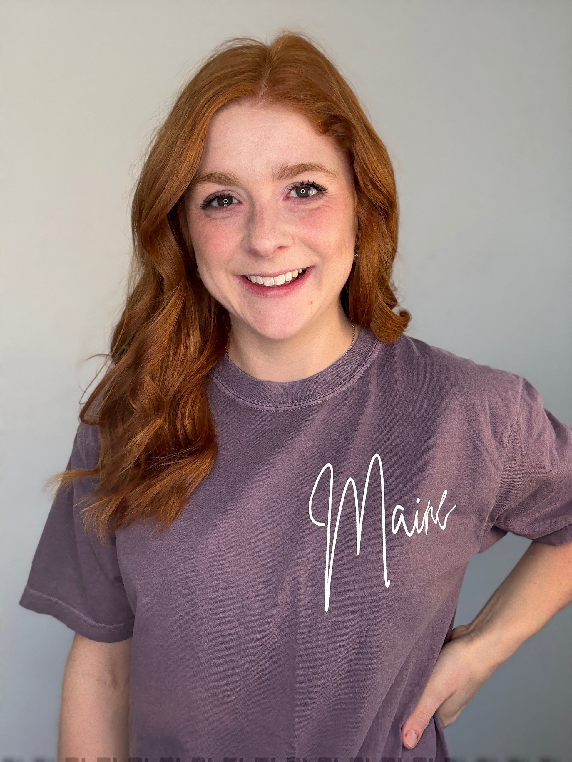 A smaller sized design that display's the word "Maine" in cursive writing on the pocket area of a Comfort Colors t-shirt! A simple and versatile piece for all Mainers!